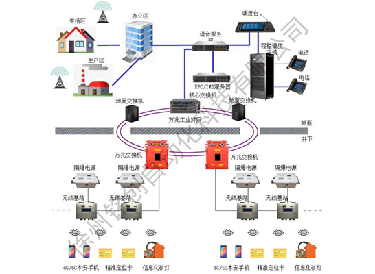 礦用無線通信系統(tǒng)由綜合語音服務器、錄音服務器、4G/5G核心網系統(tǒng)、上網行為管理系統(tǒng)、觸摸屏調度臺、地面無線基站、礦用本安型基站、礦用本安型手機、礦用隔爆兼本質安全型電源、光纜等組成。基于VOLTE的高清音視頻通話與傳輸技術,可進行可視通話、視頻回傳和視頻推送等業(yè)務,為礦井提供語音通信、數據傳輸、多系統(tǒng)融合調度、可視化調度等多種應用功能。具備WIFI覆蓋、精確定位、運輸管理、設備管理等多種應用擴展,真正實現(xiàn)萬物互聯(lián)。