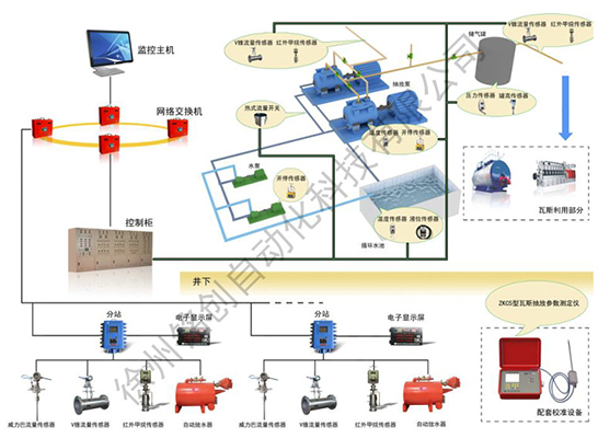 對(duì)井上下抽采管道內(nèi)氣體的流量、溫度、壓力、甲烷濃度、一氧化碳濃度等進(jìn)行連續(xù)監(jiān)測。自動(dòng)計(jì)算管道瓦斯混合量及累計(jì)量、瓦斯純量及累計(jì)量,并能自動(dòng)記錄、查詢、打印各類數(shù)據(jù)和報(bào)表。采用流量傳感器、壓力傳感器等監(jiān)測管道參數(shù)。當(dāng)監(jiān)測點(diǎn)數(shù)據(jù)超過設(shè)定報(bào)警值時(shí),及時(shí)發(fā)出聲光警報(bào)信號(hào)。